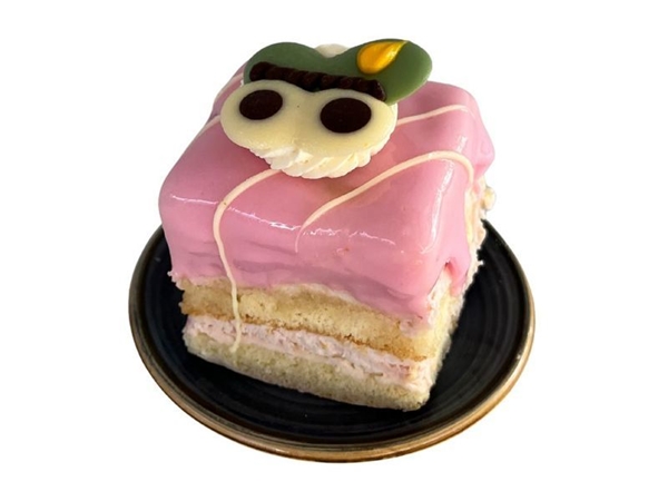 Feestelijk cakegebakje met een vulling van luchtige en frisse frambozencrème gedompeld in roze gekleurde fondant en voorzien van een mooie decoratie.