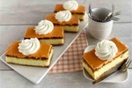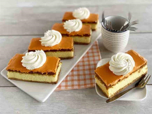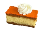 Verse banketbakkersroom tussen knapperig roomboterbladerdeeg, bedekt met een laag oranje fondant en een rozet slagroom.